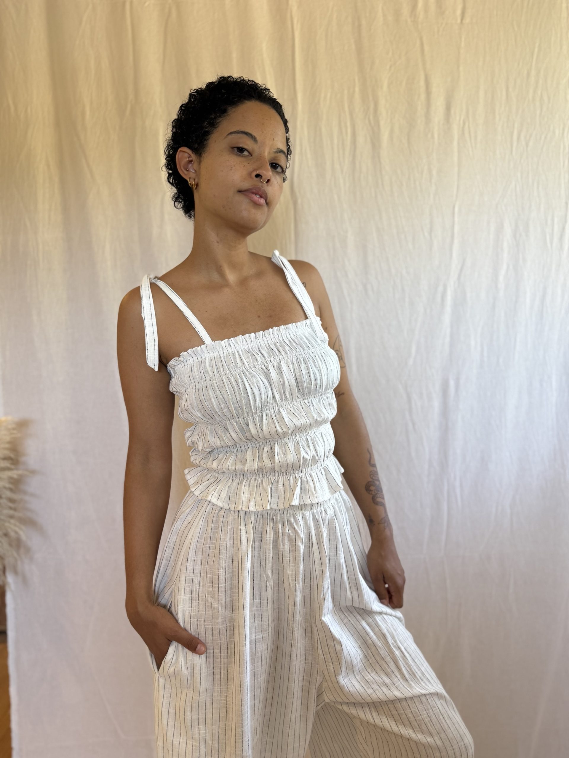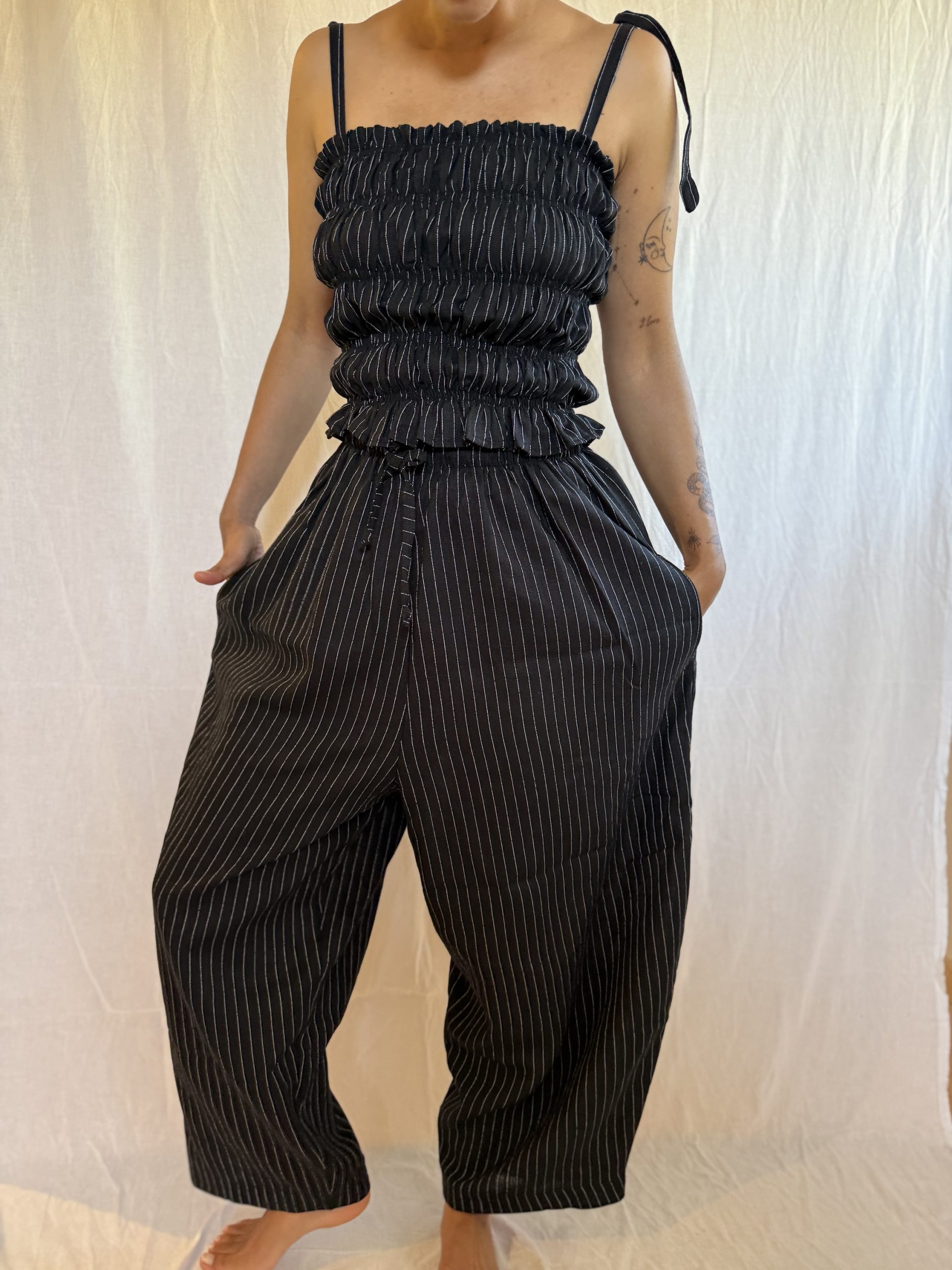 Part of our Picnic Set, our Picnic Pants, are a loose fitted barrel style with and elasticated waist and functional drawstring. They have really nice deep pockets for all the things.